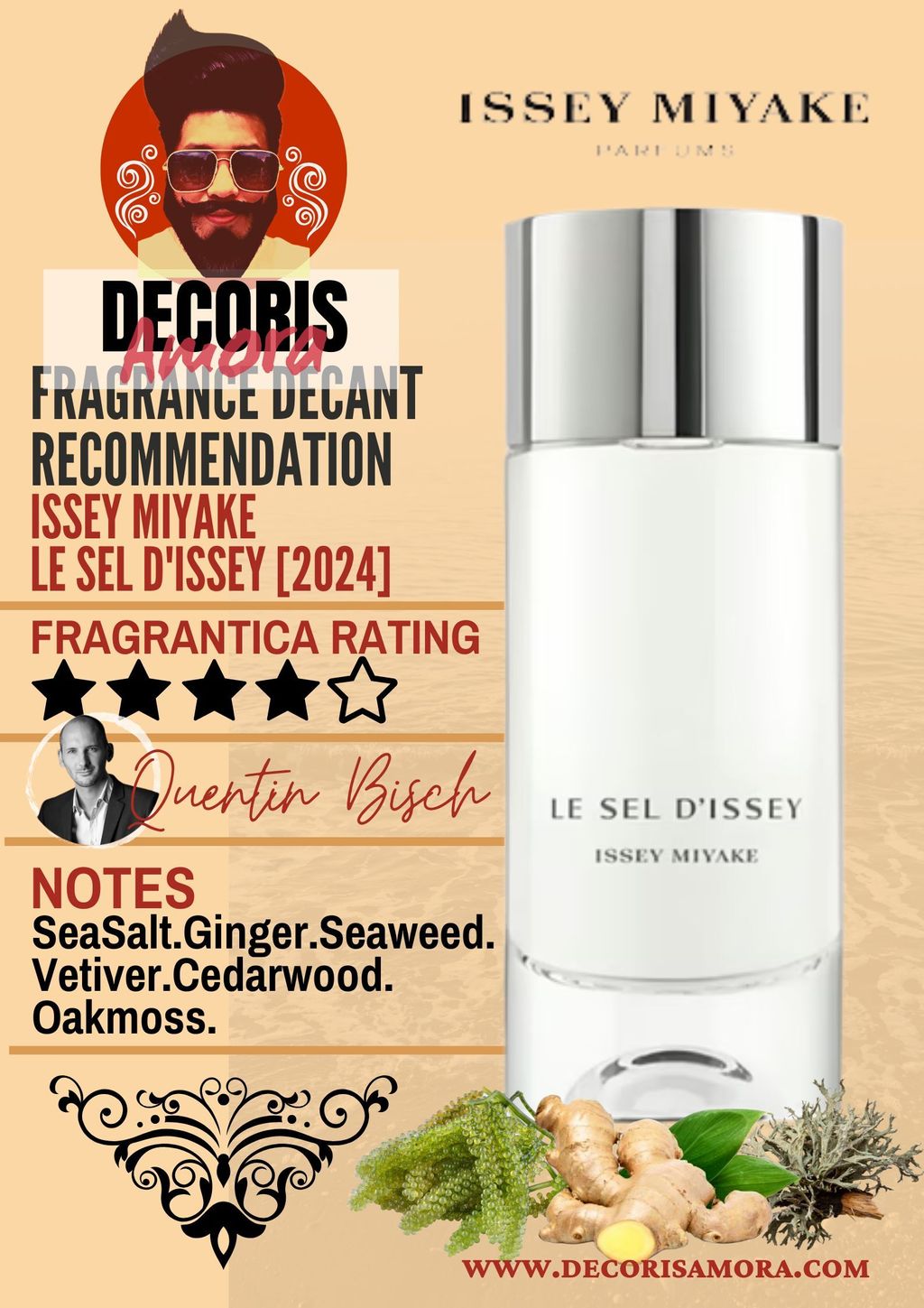 Le Sel d’Issey EDT by Issey Miyake is a Woody Aquatic fragrance for men. This is a new fragrance. Le Sel d’Issey was launched in 2024. The nose behind this fragrance is Quentin Bisch. Top notes are Sea Salt and Ginger; middle notes are Seaweed and Vetiver; base notes are Cedarwood and Oakmoss.