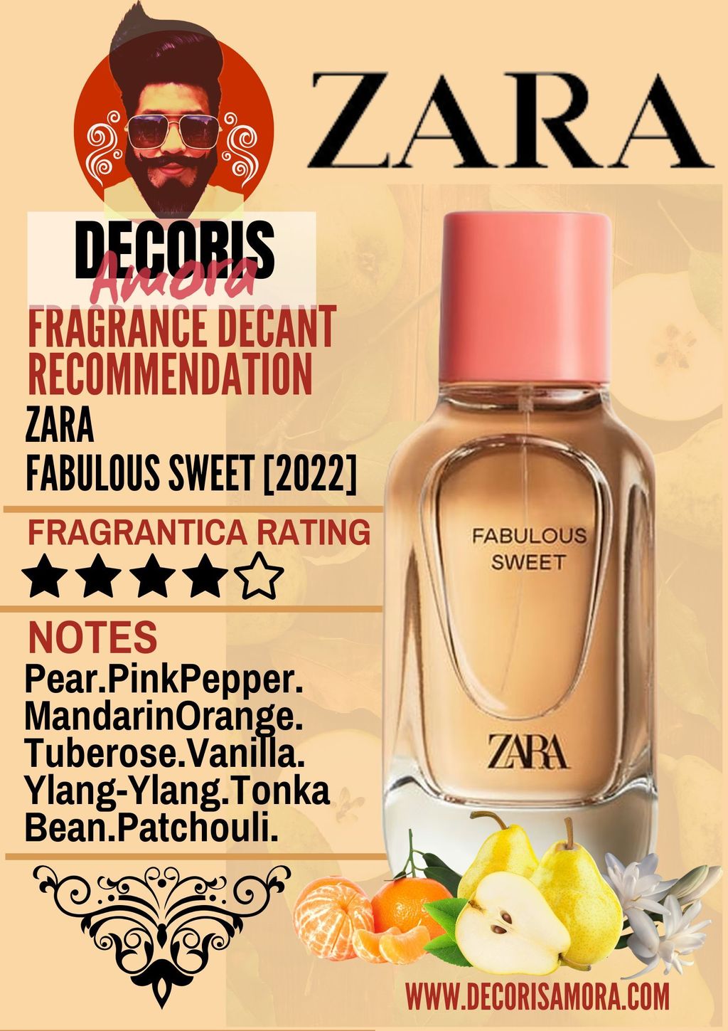 Fabulous Sweet by Zara is a Floral Fruity Gourmand fragrance for women. This is a new fragrance. Fabulous Sweet was launched in 2022. Top notes are Pear, Mandarin Orange and Pink Pepper; middle notes are Tuberose, Ylang-Ylang and Coconut Water; base notes are Vanilla, Tonka Bean and Patchouli.